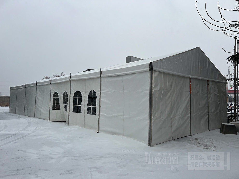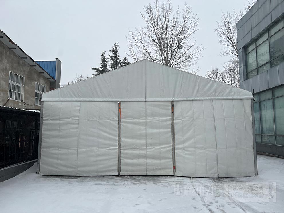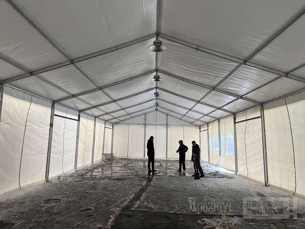 華之熠篷房的篷布是有保溫材料的,可以阻擋一部分寒冷空氣,同時建議您配備上取暖設(shè)備,正常開啟暖風(fēng)機(jī)或空調(diào)的情況下,在雪天,篷房頂部也不會有太多積雪,也能夠進(jìn)一步提高室內(nèi)溫度,確保篷內(nèi)工作人員可以感受到溫暖和舒適。