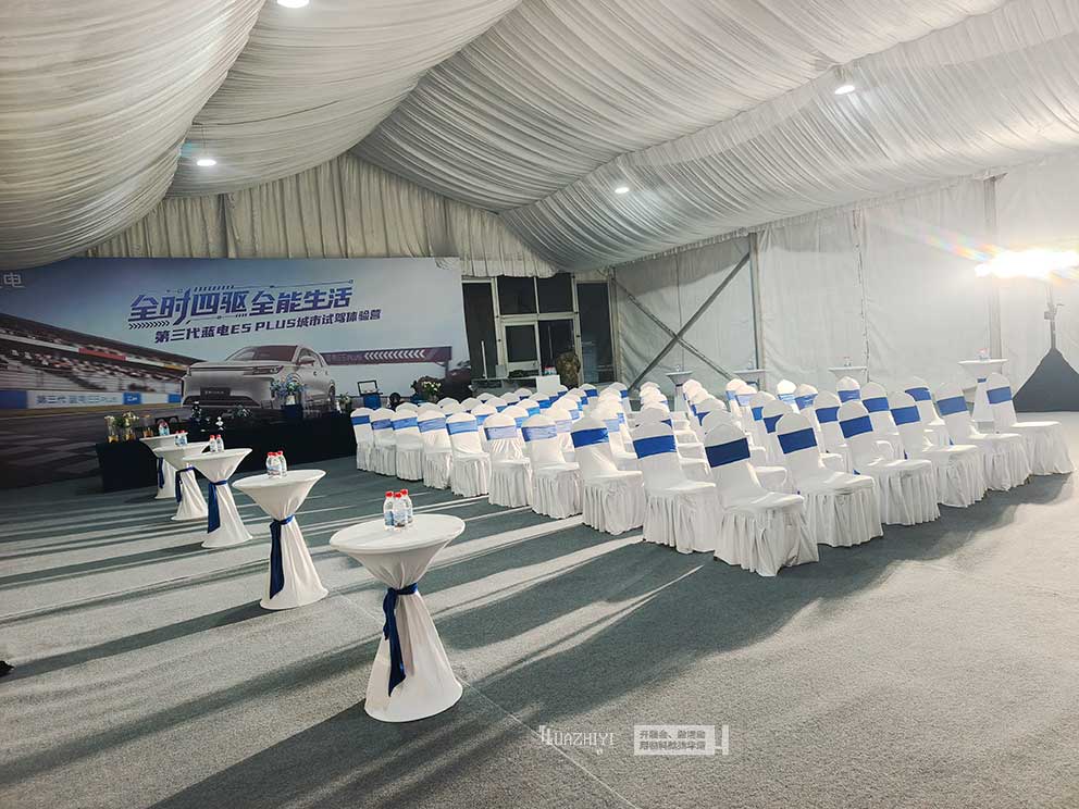 商丘篷房出租圍繞試駕會的核心需求,構(gòu)建了多維度的布場體系。核心接待與休息區(qū)域采用玻璃篷房搭建,通透的玻璃幕墻最大化引入自然光線,讓篷房內(nèi)明亮開闊,為參與者營造了舒適的休憩環(huán)境,同時與經(jīng)開試駕場的戶外場景自然融合。篷房內(nèi)整齊擺放的貴賓椅,以簡約大氣的設(shè)計與舒適的坐感,為嘉賓提供了優(yōu)質(zhì)的休憩體驗;搭配的吧桌則方便嘉賓放置飲品、交流試駕感受,兼顧實用性與社交屬性。
