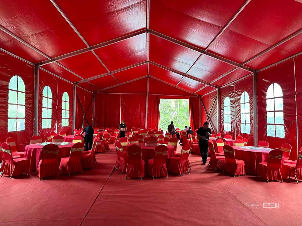焦作篷房租賃為婚禮搭建的紅色篷房,是整個場地布置的核心亮點。篷房采用大跨度人字形設計,篷身選用高密度紅色PVC篷布,色澤濃郁飽滿,在陽光下呈現(xiàn)出熱烈而不失莊重的質(zhì)感;篷布表面經(jīng)過特殊處理,不僅防雨防曬,還能有效提升篷內(nèi)亮度。