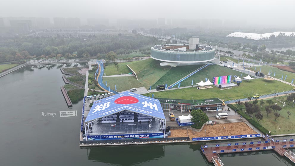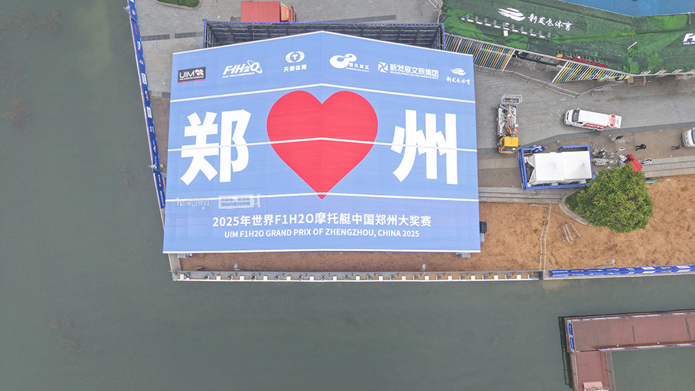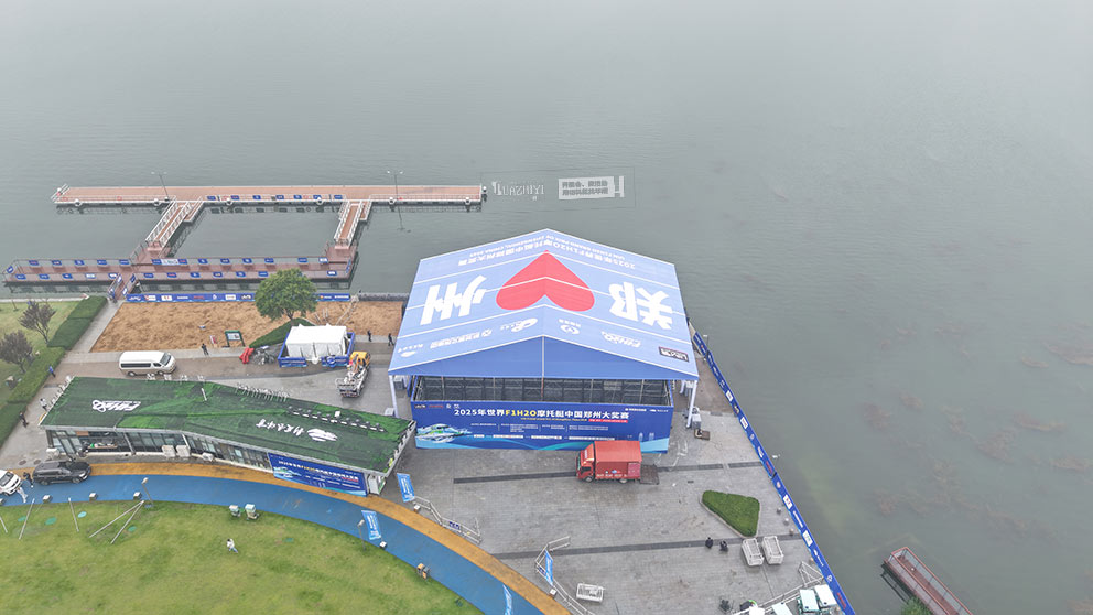 棚頂醒目位置印制了碩大的賽事全稱“2025年世界F1H2O摩托艇中國鄭州大獎賽”與“鄭州”字樣。篷房采用大跨度人字形結(jié)構(gòu),四周無篷布的開放式設(shè)計,讓篷房既保持通透開闊的視野,又能讓棚頂?shù)馁愂聵俗R從各個角度清晰可見,成為賽場周邊極具辨識度的視覺焦點,向全球觀眾傳遞著鄭州承辦國際賽事的熱情與實力。